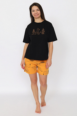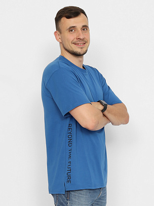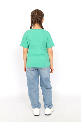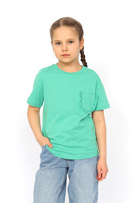 Футболка со спущенным плечом и короткими рукавами. Спереди карман декорирован ришелье. Горловина круглая, обработана притачной бейкой. По ростку горловины шов притачивания закрыт долевиком.