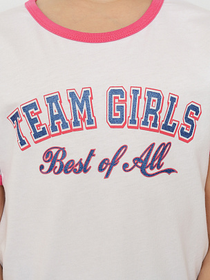 Футболка для девочки с трендовым колледж-принтом, с блестящим эффектом и контрастными бейками по горловине и рукавам. Модель сделана из 100%-хлопкового трикотажа. Материал приятно прилегает к телу, не сковывает движения и позволяет коже дышать.