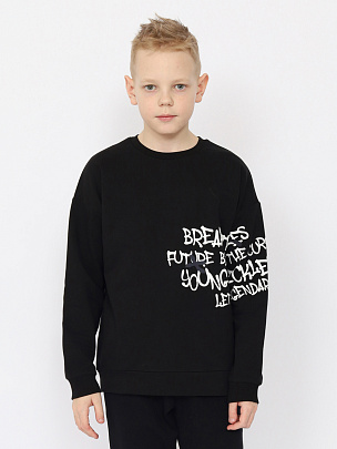 Джемпер для мальчика свободного силуэта с карманом спереди и притачным эластичным поясом по низу. Горловина круглая, обработана притачным воротником из полотна с эластаном. Рукава длинные с эластичными манжетами по низу. Перед джемпера декорирован принтом "Маленькие шаги приводят к большим переменам".