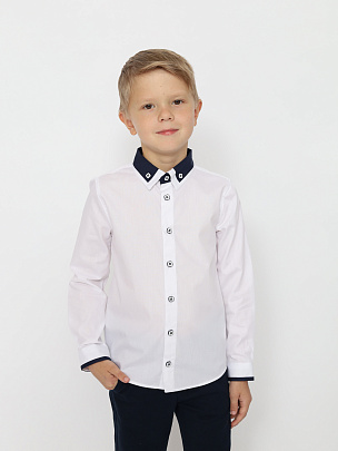 Классическая блузка из хлопка, свободного силуэта с отложным воротником и длинными рукавами с манжетами. Застёжка центральная на планку с пуговицами, декорирована принтом ввиде надписей на полочках.