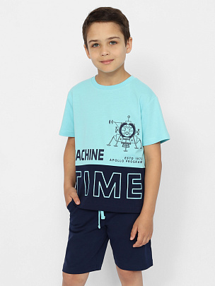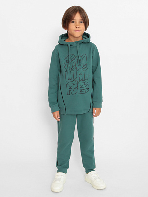 Толстовка с длинными втачными рукавами и манжетами из полотна с добавлением эластана. В нижней части толстовки расположена декоративная планка контрастного цвета. Капюшон с лицевой частью и декоративным принтом, шнурок декорирован вязаной нашивкой. Перед декорирован принтом "Панно" мир динозавров. Брюки с притачным поясом, манжетами и функциональными карманами. Пояс и манжеты выполнены из полотна с эластаном.